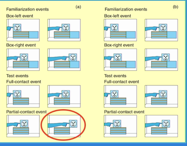 children looked longer at imposible event–>habituation