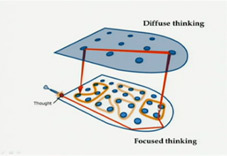 The focused mode of thinking can be seen as a pinball machine that has bumpers which are very tightly grouped together, so the pinball (the thought) can’t go very far without bumping into a bumper.