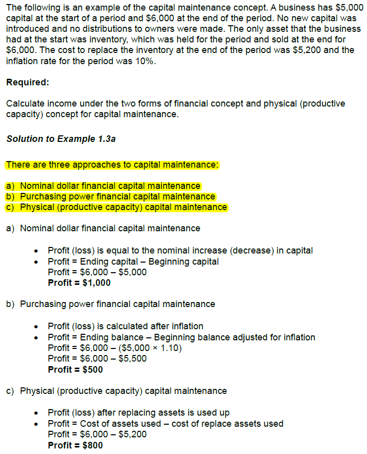 Financial concept takes 2 forms: nominal dollar (based on historical cost) and purchasing power (takes into account inflation).