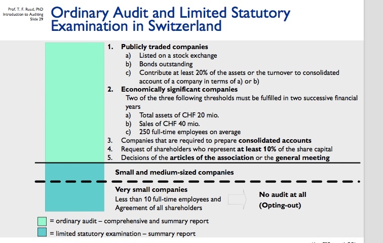 1. Publicly traded companies a) Listed on a stock exchange b) Bonds outstanding c) Contribute at least 20% of the assets or the turnover to consolidated account of a company in terms of a) or b) 2. Economically significant companies Two of the three following thresholds must be fulfilled in two successive financial years a) Total assets of CHF 20 mio. b) Sales of CHF 40 mio. c) 250 full-time employees on average 3. Companies that are required to prepare consolidated accounts 4. Request of shareholders who represent at least 10% of the share capital 5. Decisions of the articles of the association or the general meeting –> ordinary audit – comprehensive and summary report ——————————————————————————– Small and medium-sized companies Very small companies Less than 10 full-time employees and Agreement of all shareholders –> No audit at all (Opting-out)