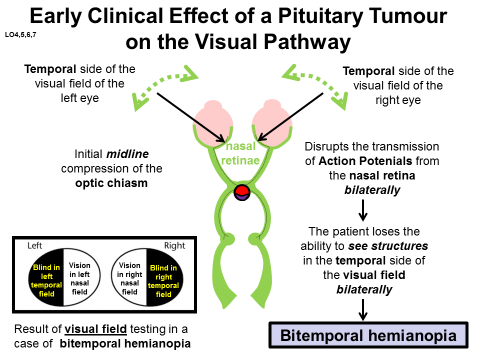 This results in disruption of the action potentials from the nasal retinas, meaning the patient loses the ability to see structures in the temporal side of the visual field, bilaterally