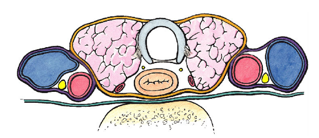 Trachea (anterior) and Oesophagus (posterior) lie in the centre line. In between these are the Recurrent Laryngeal Nerves