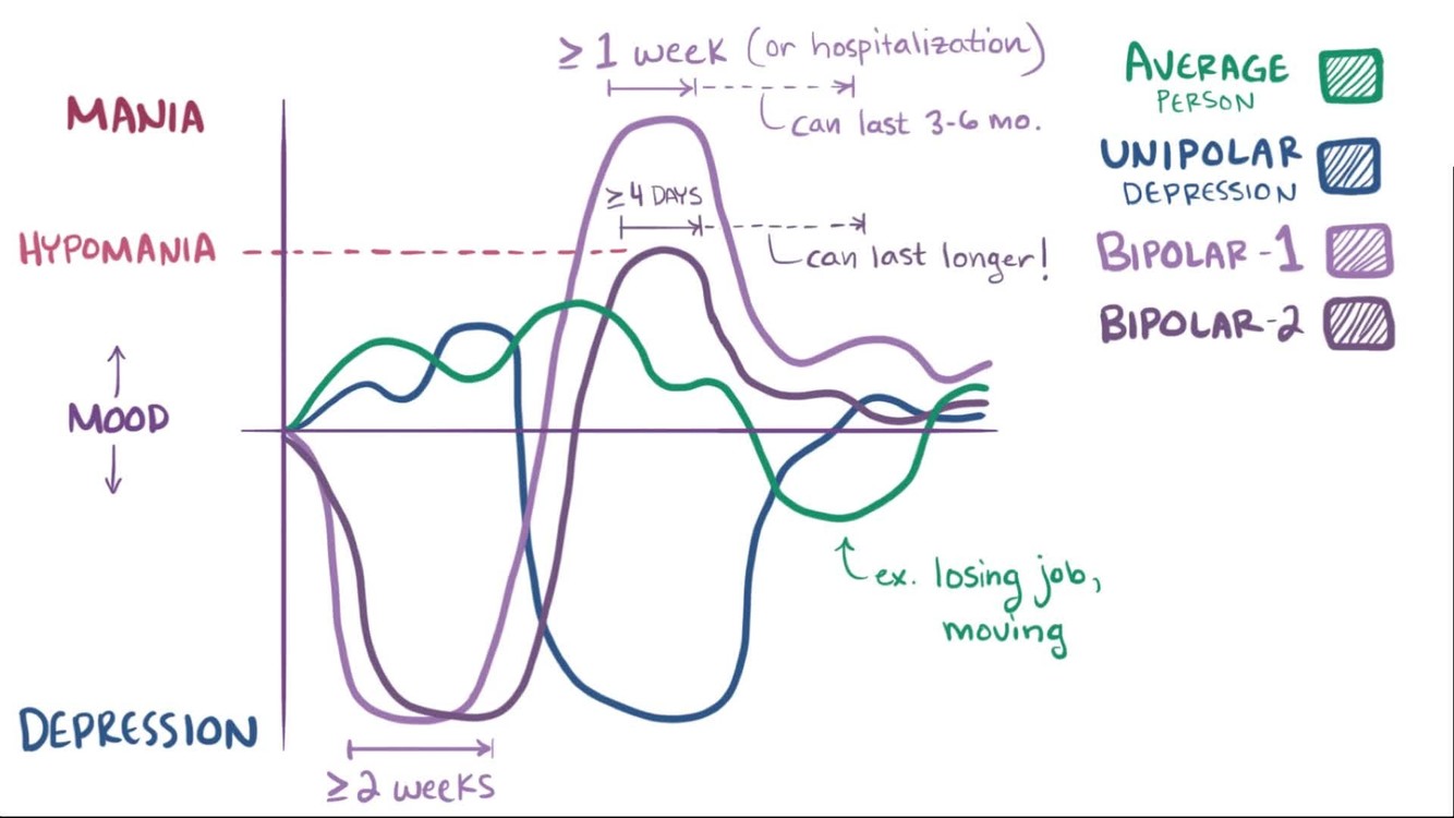Unipolar disorders go from a period of “normalcy” downwards, and back up, but never past this.
