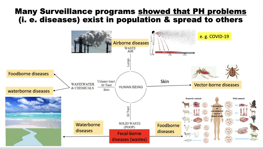 Surveillance, patrolling, investigating to see if there is any evidence of sickness or death. Can be airborne, waterborne, foodborne, or vectorborne. We need to register how many people are sick from either respiratory disease, diarrhea, etc. with age, sex, location etc.