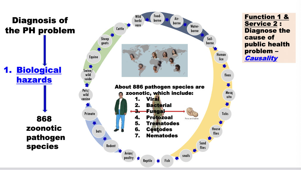 More than 800 different pathogens affect people (zoonotic) either through direct contact, airborne, food.