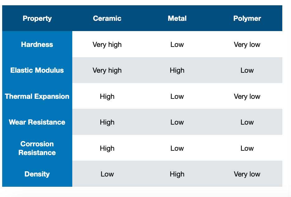 Compare ceramics, metals and polymers