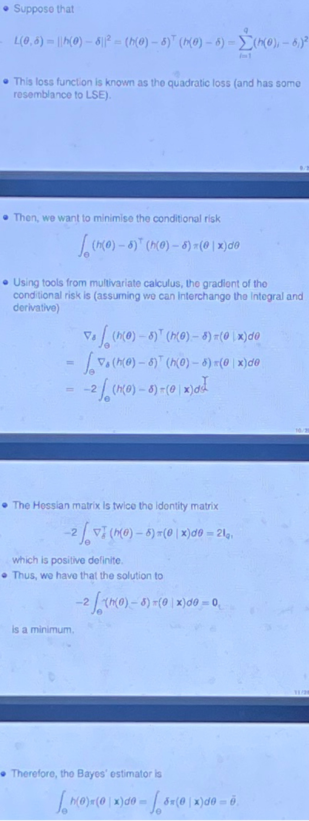 2) as L is rv can’t minimise directly -> define conditional risk: Eπ(θ|x)[L(θ,δ) ] = integral ( L(θ,δ) π(θ|x) )dθ = R(δ)