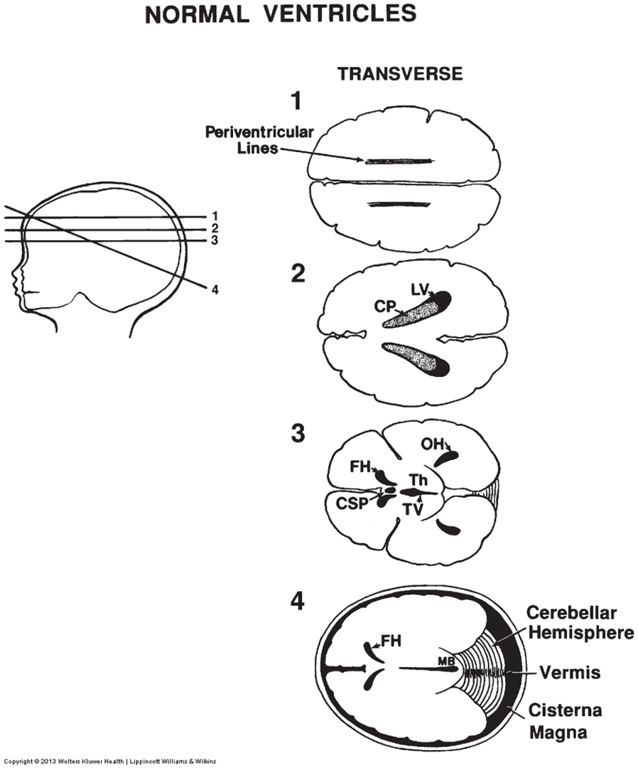 what is important to note for each level of the normal ventricles and intracranial anatomy on the transverse view (levels 1 through 4)