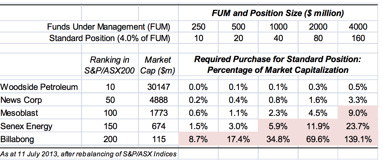 ) Ability to trade small-medium sized companies quickly without moving the market is much diminished. Manager would face an increasingly difficult trade-off between potential market impact from trading, and the speed at which a position can be accumulated or exited at attractive prices.