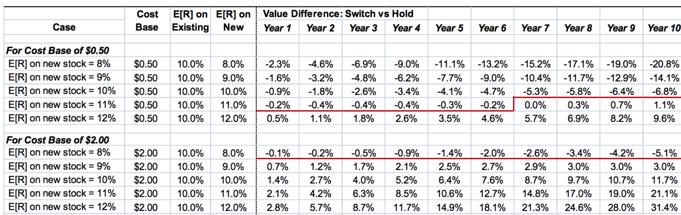 When both the existing and new stock have the same E[R] of 10.0%, the value difference at the end of year 10 is -6.8% for a cost base of $0.50 and +11.7% for a cost base of $2.00. These are economically meaningful differences in value, equating to differences in annualized return of about -0.7% and +1.1%.