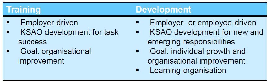 Training: train to perform a given task or job successfuly. Final goal is IMPROVING performance in the current job and thus improvement of the organisation’s performance. VL: and guide career development