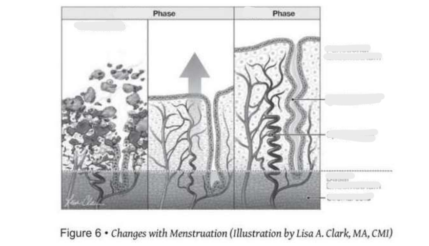 o Middle shows spiral arteries, uterine glands begins reforming, lining rich in nutrients and blood flow through arteries