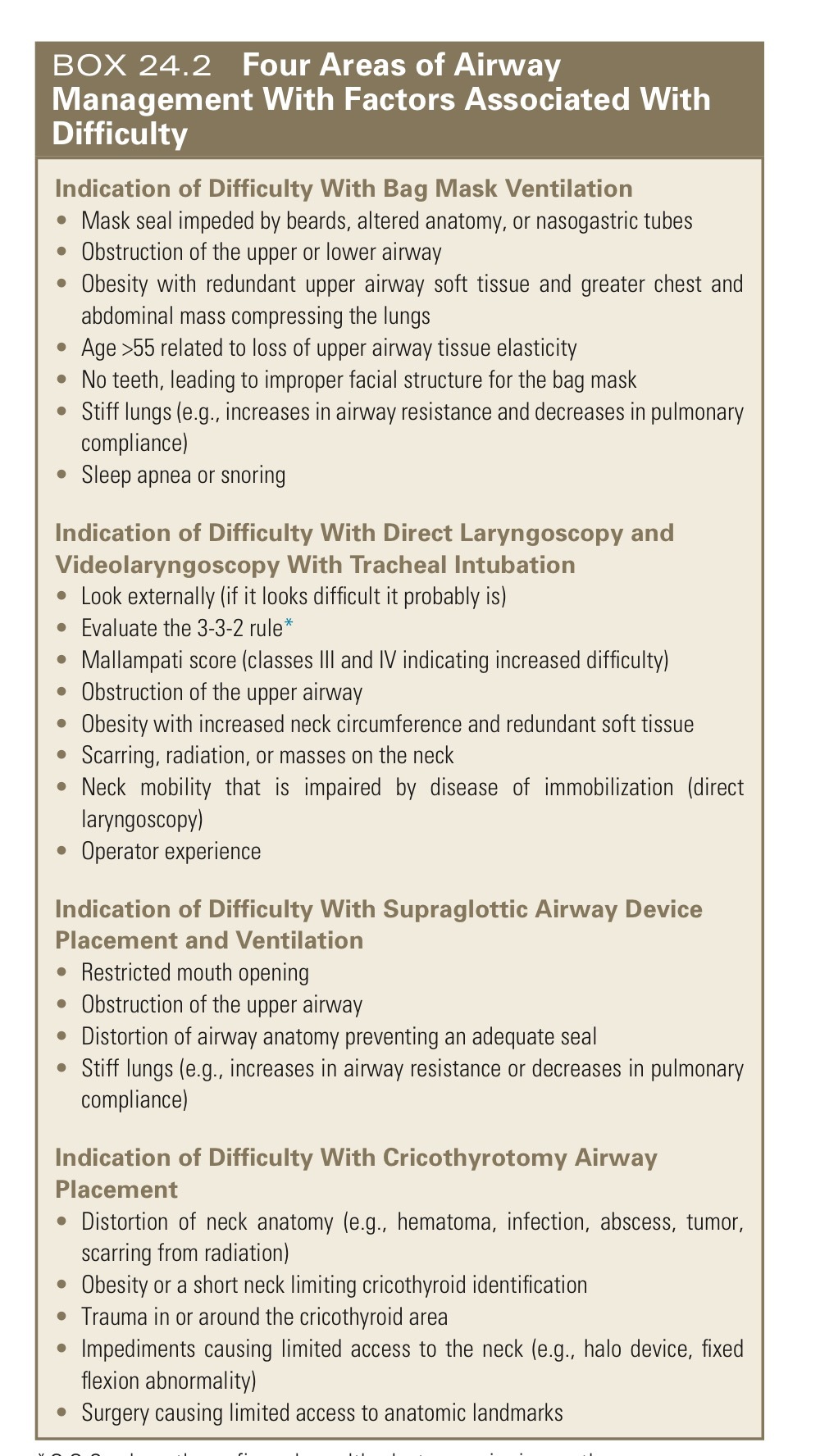 Mask seal impediments (facial hair, altered facial anatomy, lack of teeth, NG tube), upper airway obstructions, obesity, elderly, Mallampati III or IV, short thyromental distance, snoring (OSA), and poor lung compliance