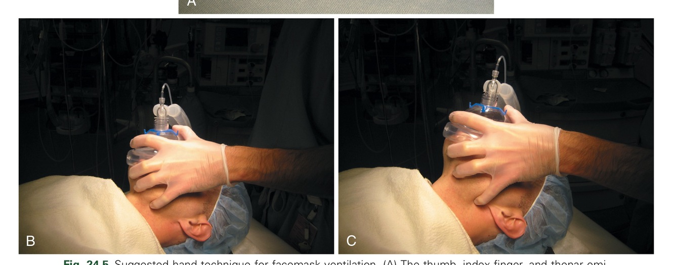 Left thumb and index finger wrapping around the mask making a C. The middle and ring fingers are placed on the bony parts of the mandible to help compress the mask and raise the patients chin. The fifth finger (pinky) is then used the provide anterior jaw thrusting maneuver placed at the angle of the mandible.