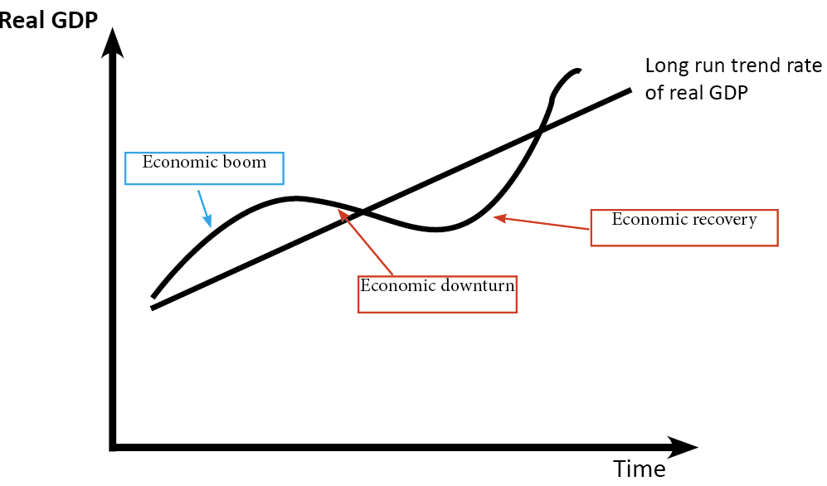 business cycles: causes and consequences of economic fluctuations like crises, unemployment, stabilisation and monetary and fiscal policy