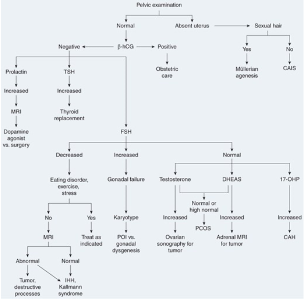 incorrect establishment of the GnRH pulse generator “set-point” at puberty, so the pituitary gland responds with inappropriate and excessive LH secretion -> leading to premature arrest of ovarian follicle development, ovarian hyperandrogenism and amenorrhoea