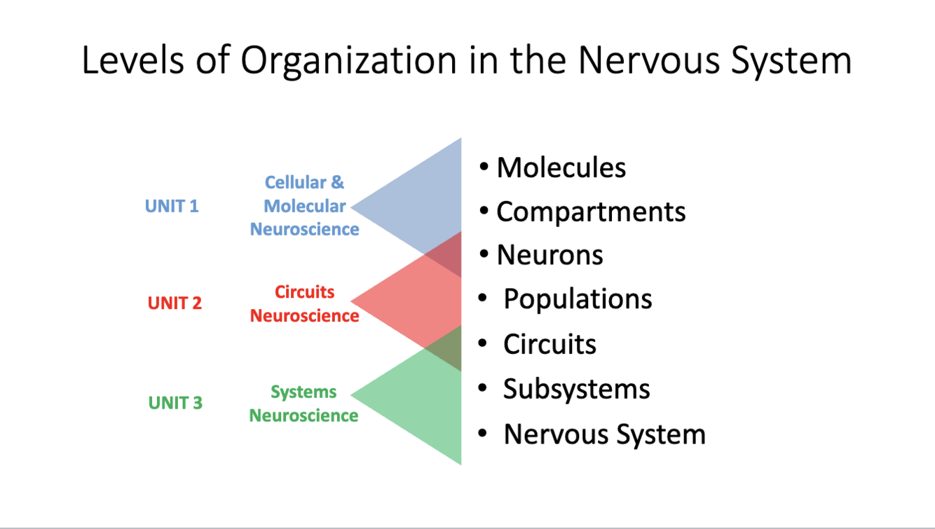 Nervous system to subsystems to circuits to populations to neurons to compartments to molecules
