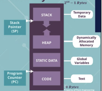 The stack starts at a high address in memory and grows downward. The ower the address, that’s the next object on the stack.