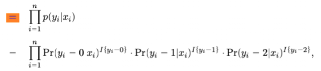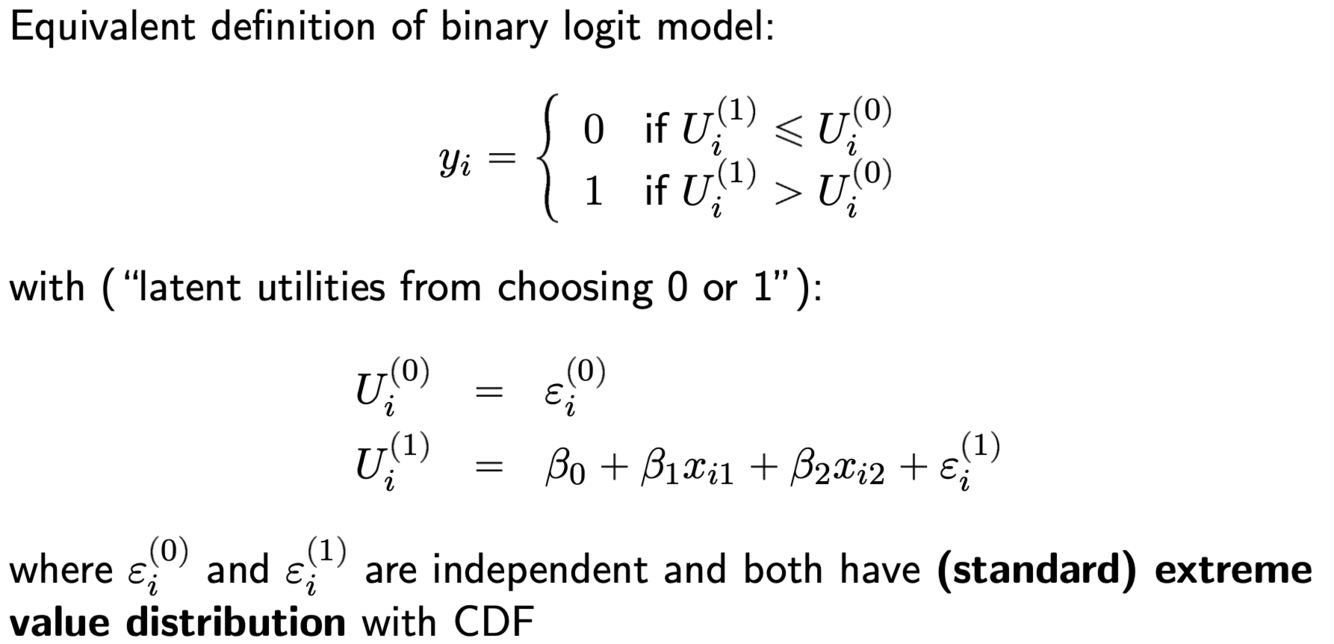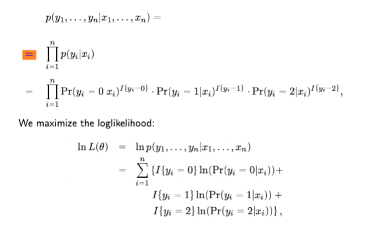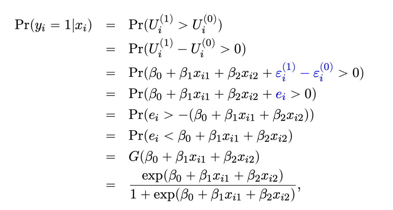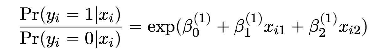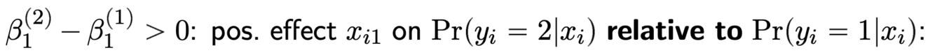 We can create a odd’s ratio between the yi = 0 and yi = 1 (see image). If we take the ln of the function then we can get the same function (without the exp). Then we can see that β1(1) > 0 there is a positive effect of xi1 on the probability of yi = 1 relative to yi = 0.