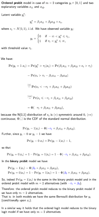 Show that the ordered logit/probit models with (m =) 2 outcomes is the binary probit/logit model.