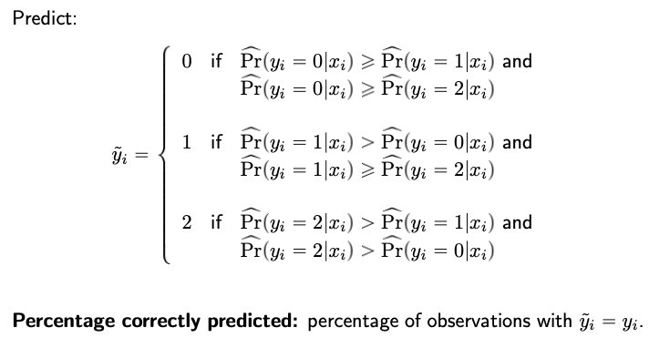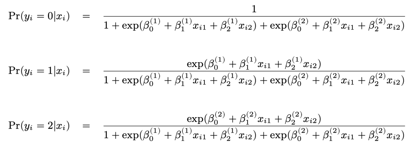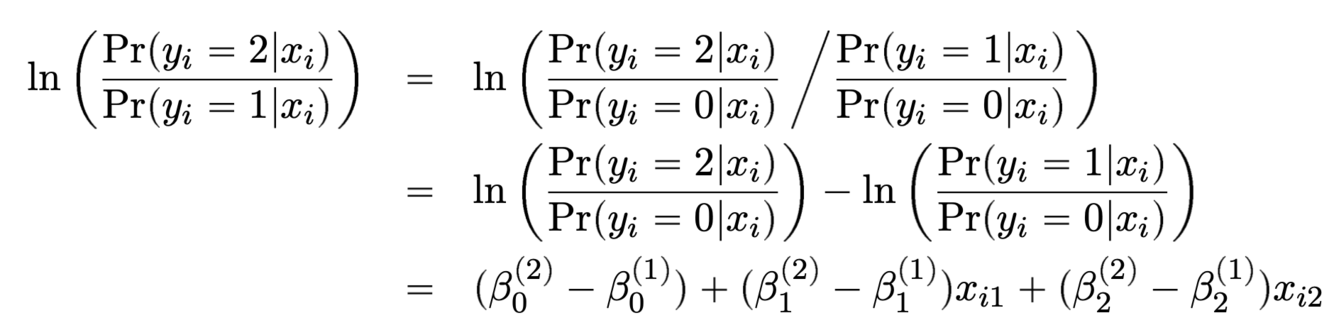 Interpret the coefficients in terms of the logarithm of the odds ratio P(yi = 1 | xi) / P(yi = 0 | xi) and the logarithm of the odds ratio P(yi = 2|xi) / P(yi = 0|xi) from the Multinomial logit model.