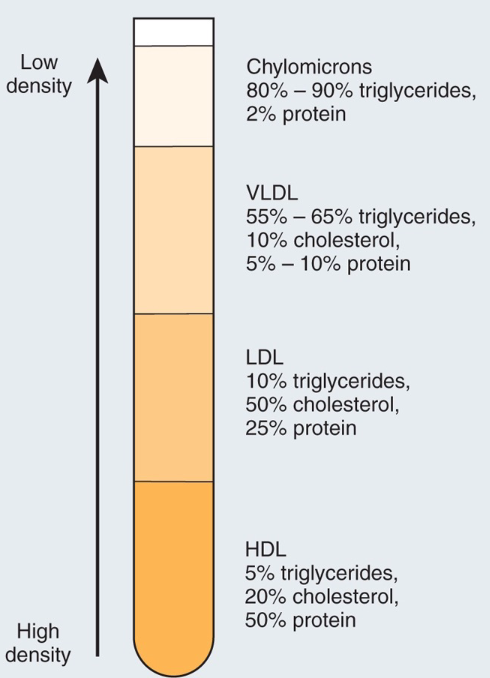 Cholesterol esters and Triglycerides are located in the hydrophobic core of the macromolecule, surrounded by phospholipids and apoproteins