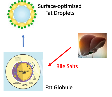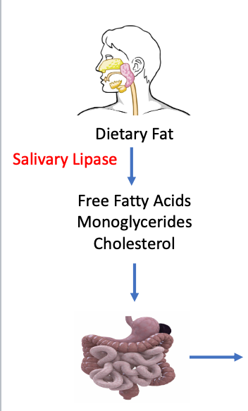 diary fat eaten, salivary lipase secreted, presence of free fatty acids, monoglycerides, cholesterol.