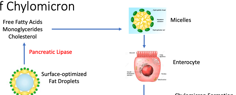 Hydrolyzes conversion of TG to Fatty Acids for absorption (LPL)