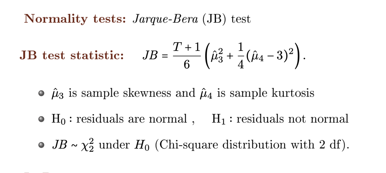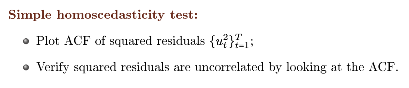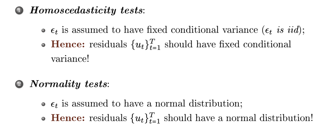 What are the two types of tests for (G)ARCH models? What are they testing?