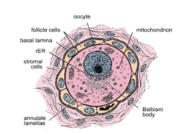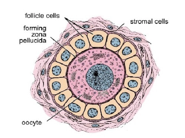 Primary oocyte surrounded by simple squamous epithelial granulosa cells