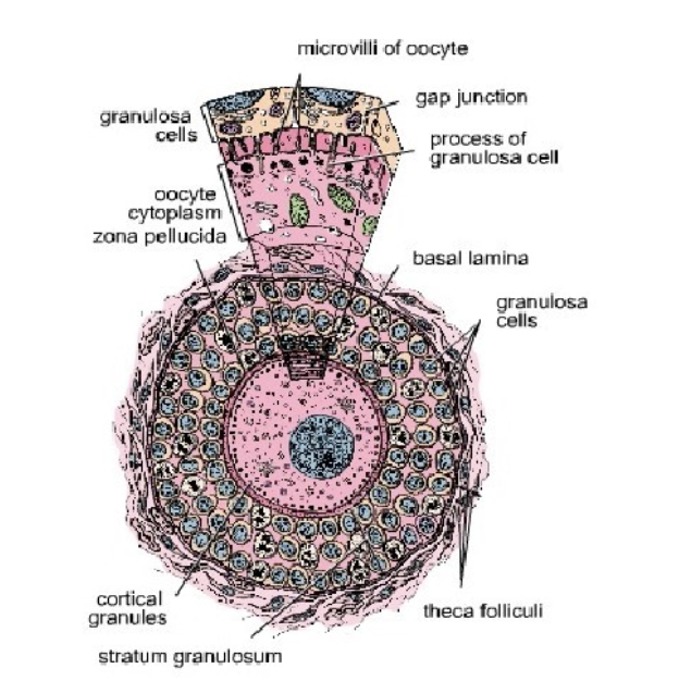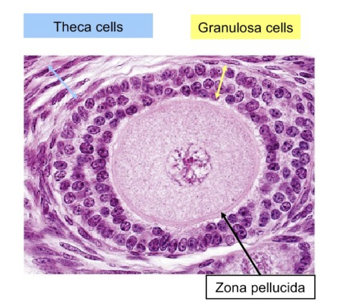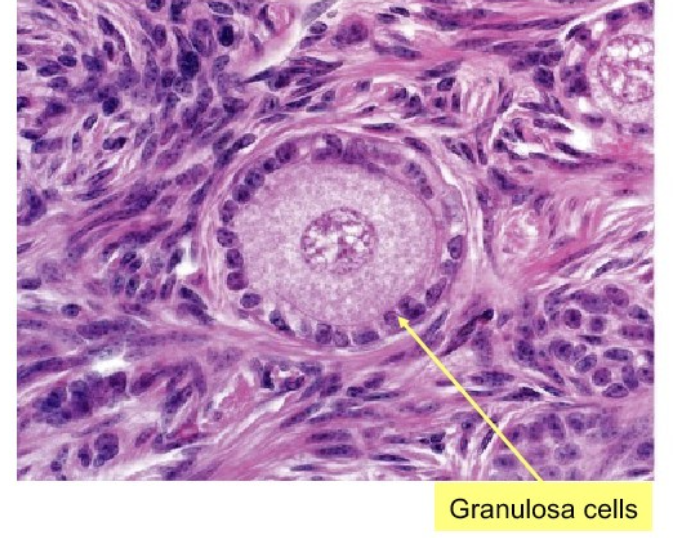 Primary oocyte surrounded by simple cuboidal epithelial granulosa cells