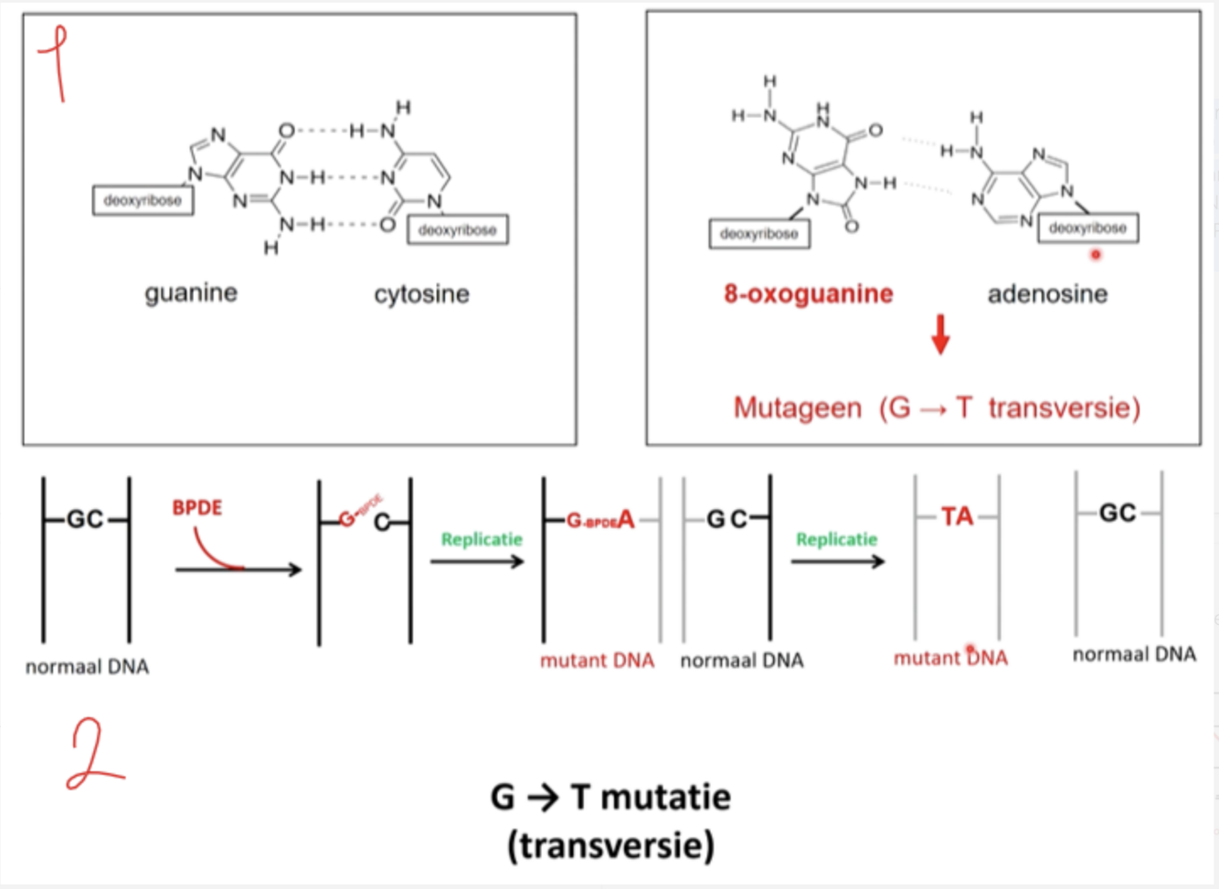 Vb. Bij oxidatieve DNA schade herkent het eiwit OGG1 de stof 8-oxogyanine in het DNA en dan begint de reparatie.