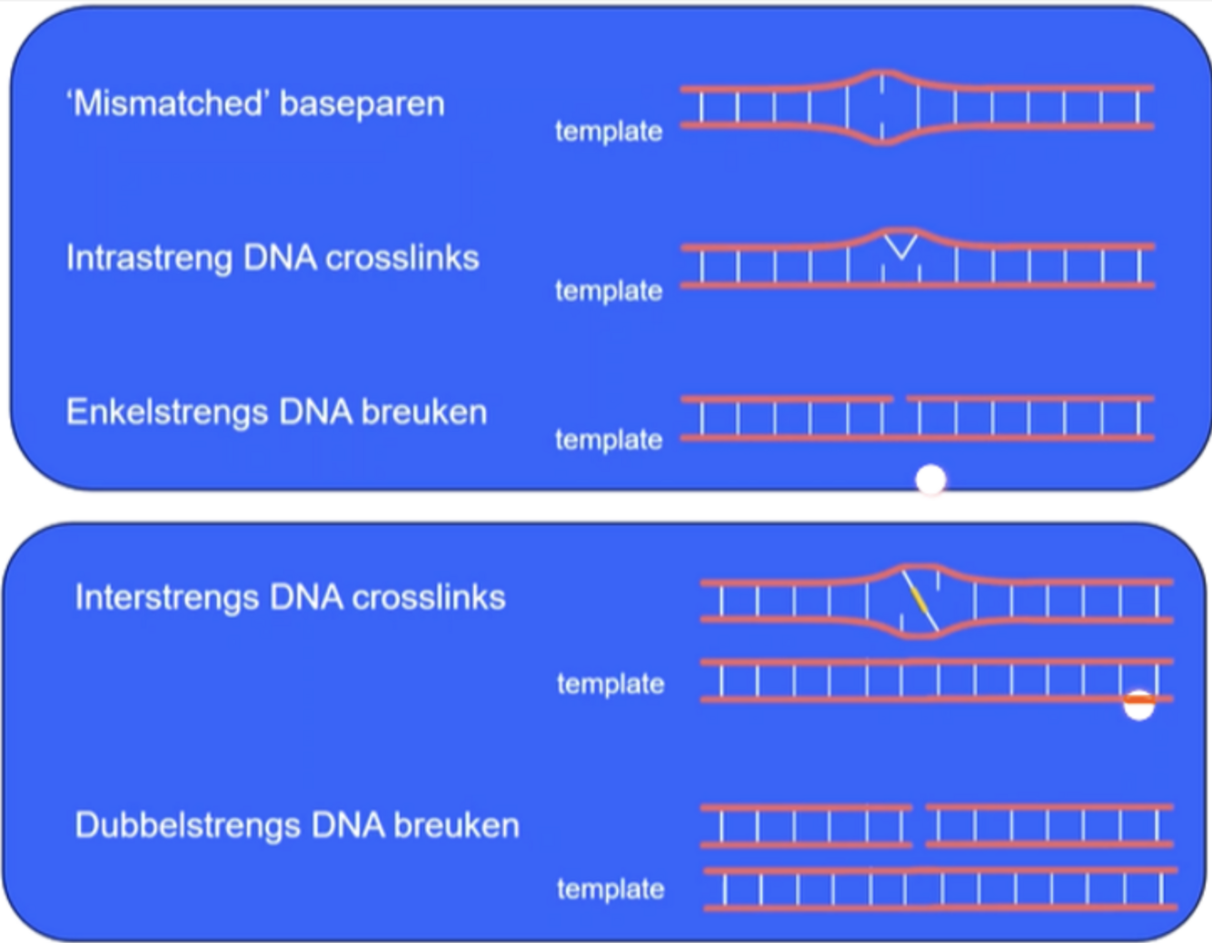 - Complementaire DNA-streng: geschikt voor herstel waarbij slechts 1 streng beschadigd is (mismatched basenparen, intrastreng DNA-crosslinks, enkelstreng DNA-breuken)