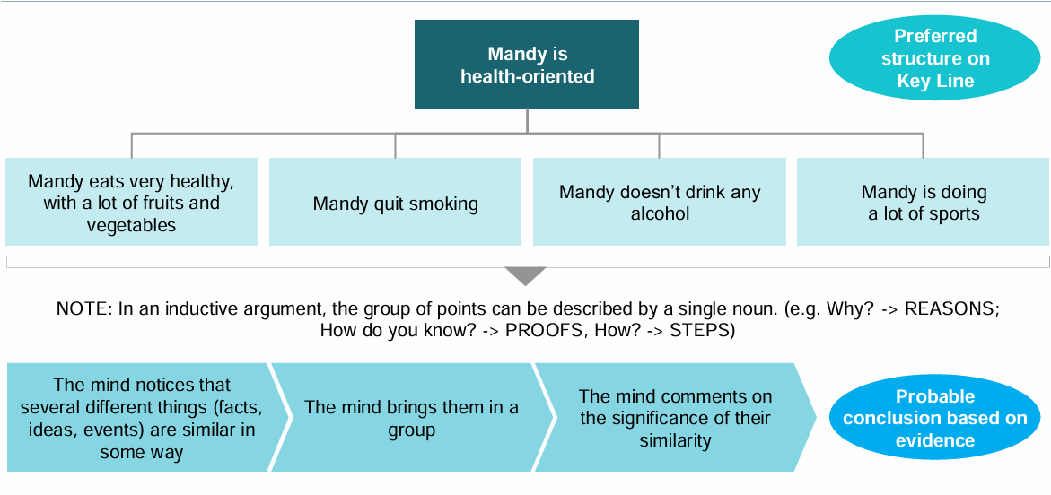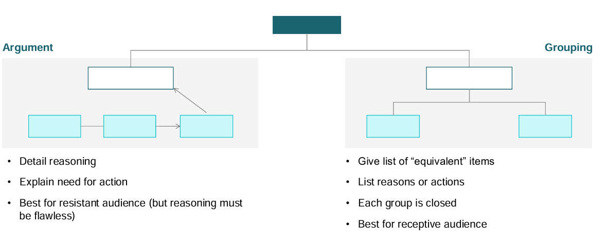 in the pyramid, ideas relate horizontally either by grouping (often inductive) or argument (often deductive). the first is better when you have to convince the client, the second more when is aligned.
