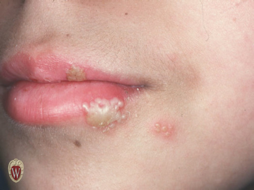 Itching, burning, tingling (12-36 hours) followed by eruption of clustered vesicles along the vermilion border