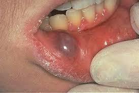 thick, mucus-type saliva produced by a damaged salivary gland which produes a clear or bluish bubble (1-2cm), movable, cystic, may rupture, bleeding possible = red/purple lesion