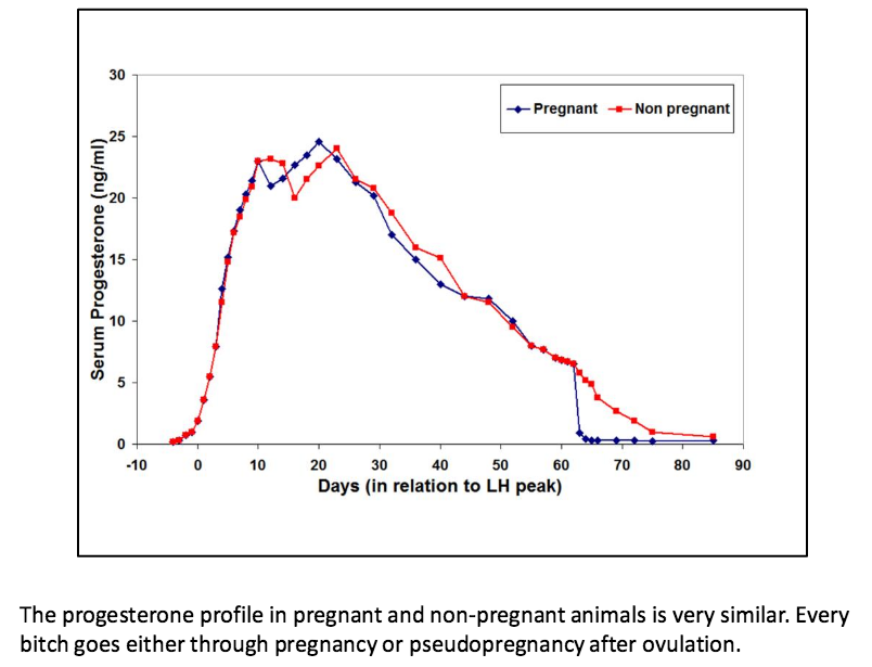 * Dioestrus: average- 57 days in the pregnant bitch, dioestrus is slightly longer in the non-pregnant bitch)
