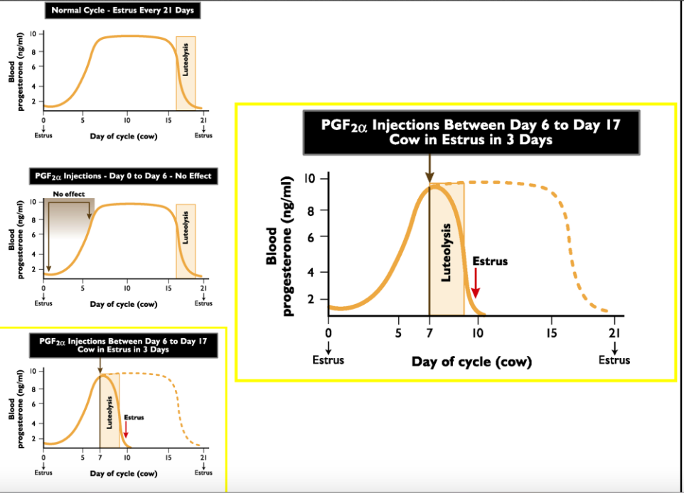 * Inducing luteolysis e.g. PGF2alpha (only works on CLs older than 5 days– also a single dose of PGF2alpha is a potent abortifacient in most domestic species)— administer 2 doses in ruminants 11 days apart and 14 days apart in horses
