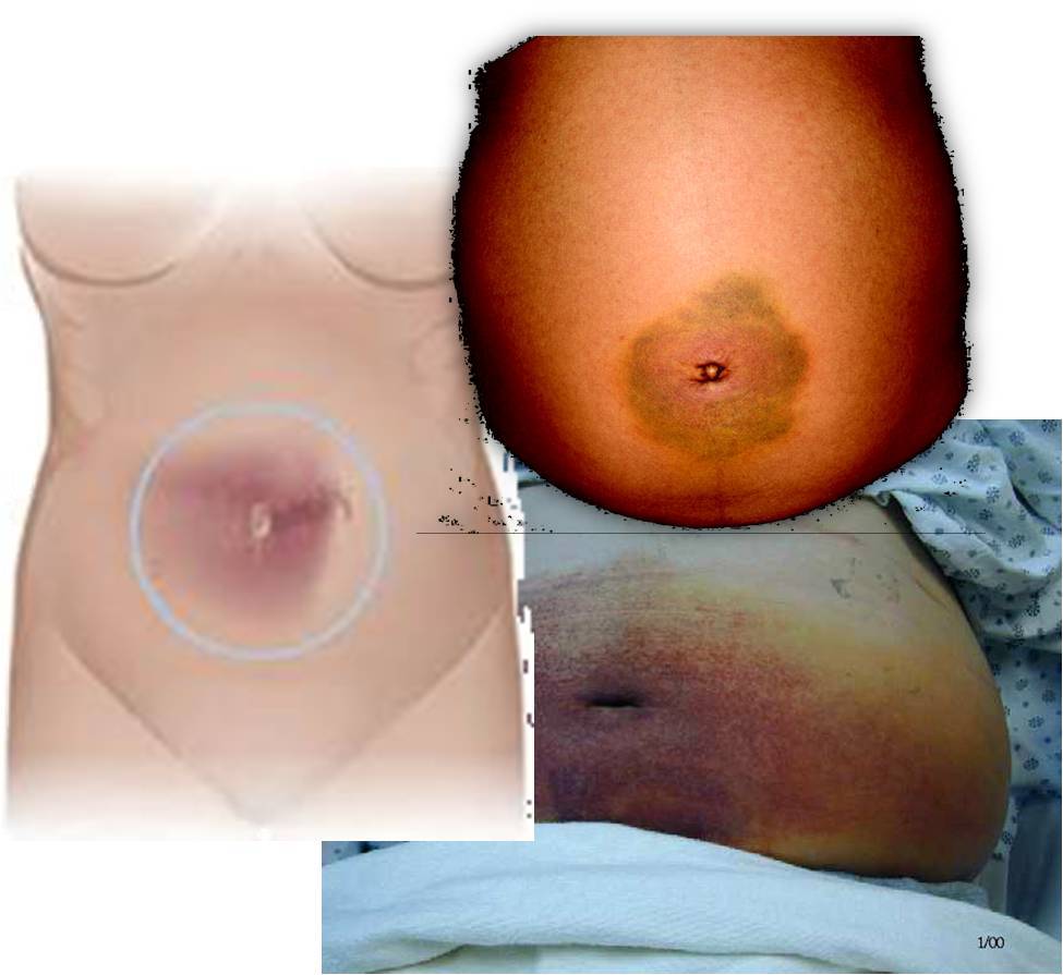 Superficial edema and bruising in the subcutaneous fatty tissue around the umbilicus.