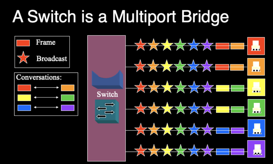 A network interconnected by bridges comprises a broadcast domain. Broadcasts from one host are seen by every other host on the bridged network.