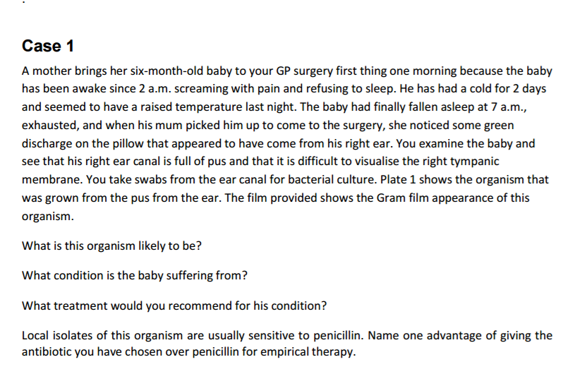 Organism - Organism is likely to be strep pneumoniae Condition - Patient is suffering from acute otitis media Treatment - Use oral amoxicillin Why amoxicillin over penicillin - covers other organism eg H.influenza and has better oral absorption