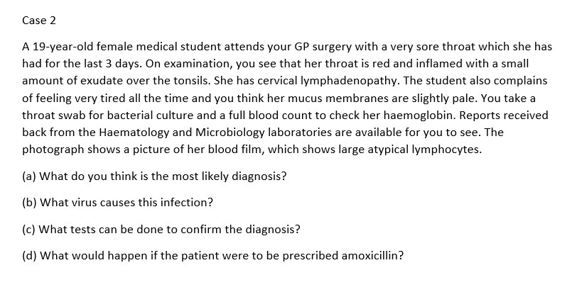 Diagnosis - Infectious mononucleosis (Glandular fever) Virus - Epstein bar virus Test to diagnose - Monospot test (can use EBV IgM) What happens if given amoxicillin - widespread rash