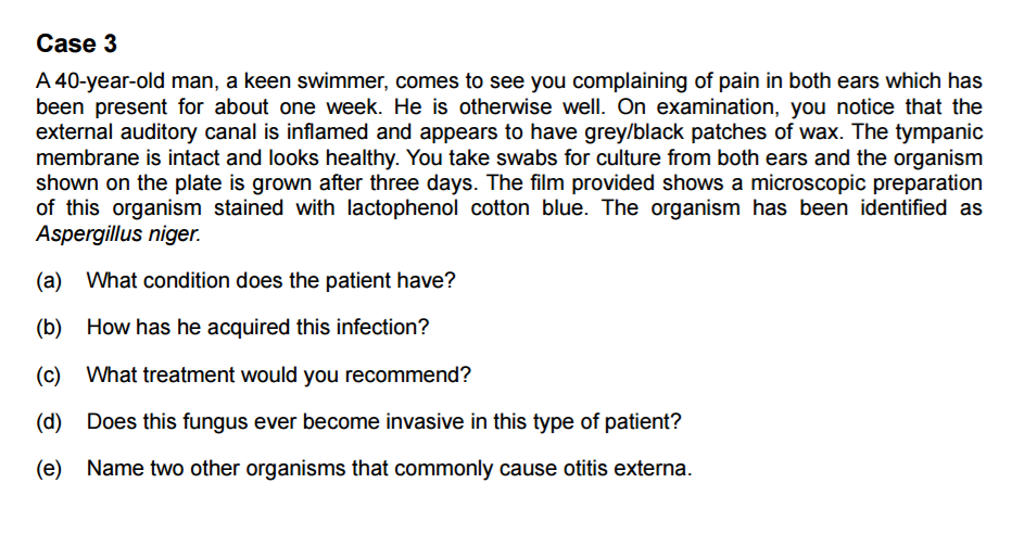 Patient has - otitis externa How has he acquired - due to being a swimmer his ear was constantly wet giving the bacteria in the surrounding environment opportunity to infect Treatment - aural toilet to clean ear followed by clotrimazole ear drops Does the fungus become invasive - NO Two othe rorgansims - pseudomonas aerguinosa, staph aureus (can be candidia)