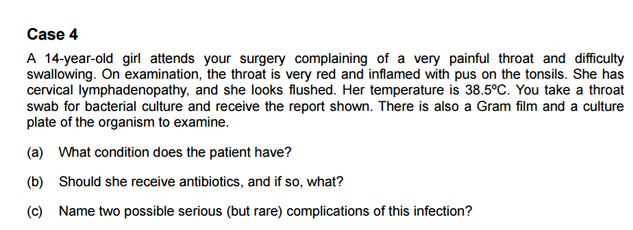 Patient has - Streptococcal sore throaat What antibiotics - penicillin Two possible serious complications - rheumatic fever and glomerulonephritis (can get strep toxic shoch syndrome)