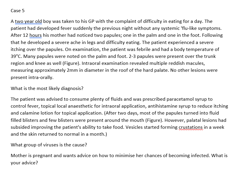 Most likely - hand foot and mouth disease Group of viruses - coxsackie virus (a group of the enteroviruses) Advice for mother - good hand hygiene has HFMD is spread via faecal oral route
