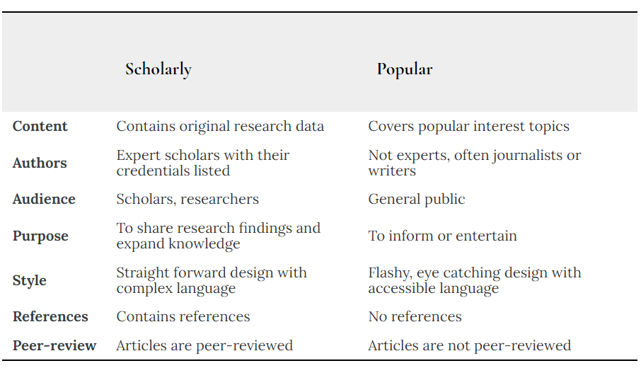 What are the basic characteristics of scholarly and popular sources?