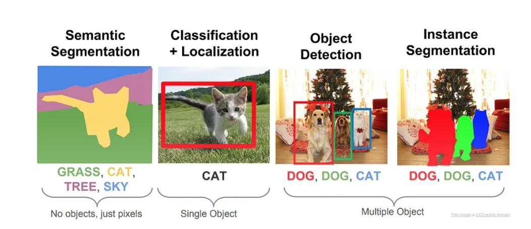 What is the difference between object detection, instance segmentation, and semantic segmentation?