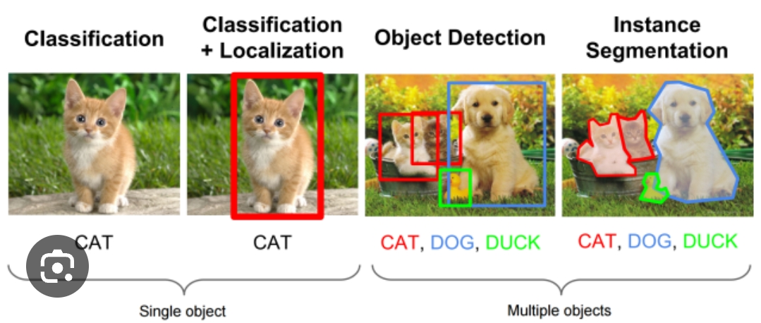 What distinguishes classification, detection, semantic segmentation, and instance segmentation in computer vision?