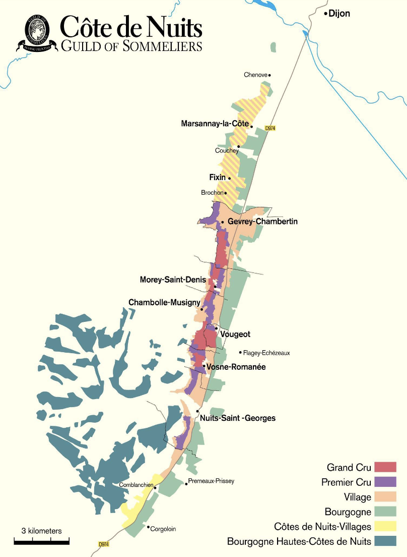 List the 9 village appellations from north to south in the Côte de Nuits: