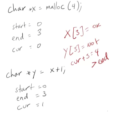 For simplicity, assume the return memory address starts at 0 and goes to 3. The current address we are pointing to points to 0, the start of the memory region we were allocated. We then have a pointer we create called x + 1 = y.